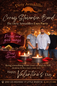 This night doubles as the Dirty Armadillo Exes Party. Expect prizes, giveaways, and a Valentine’s night with attitude. Bring something from your ex and watch it get destroyed live on stage. Items only. No people.
